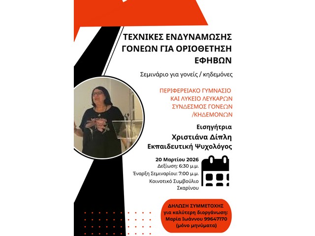 Το γυμνάσιο Λευκάρων διοργανώνει σεμινάριο με τίτιλο '' Τεχνικές ενδυνάμωσης γονέων για οριοθέτηση εφήβων'' .